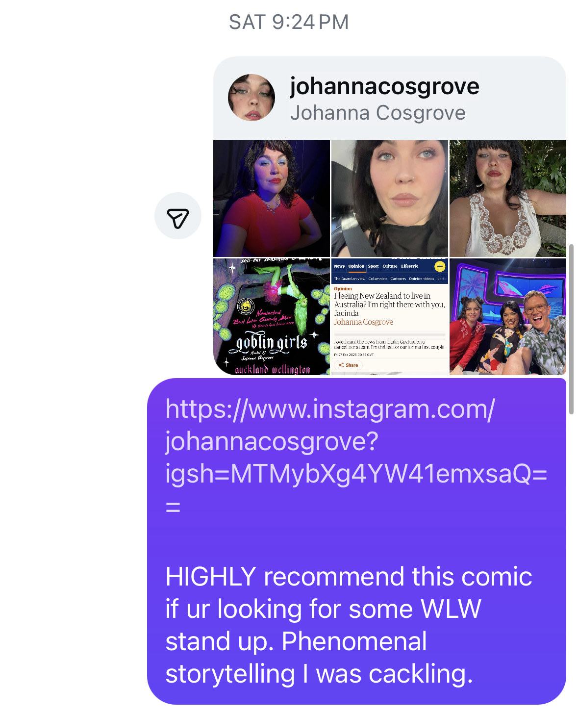Johanna tells us the story of their first girlfriend, meeting their parents, and travelling across the world for love. She has this f*cking insanely cheeky attitude to the audience which felt like a raucous and unhinged primary school drama teacher telling us about what she's been getting up to. Heartfelt and hilarious—one of my standup standouts of the festival by far.